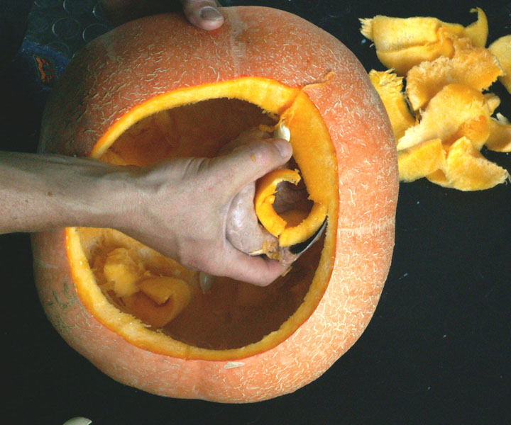 Sie benötigen dazu für einen etwa 6 kg schweren Kürbis (ca. 25 cm Durchmesser) ca. 10-15 Minuten mit der Kralle: