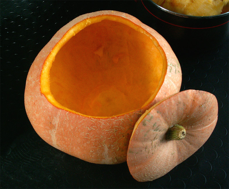 Vom Kürbis vorsichtig einen Deckel abtrennen. Innen mit der Kürbiskralle von den Kernen und dem Gewebe befreien. Die nötige Menge Fruchtfleisch mit der Kürbiskralle herausschaben, so dass ein hohler Rindenkörper übrigbleibt. Heiße Suppe in den ausgehöhlten Kürbis schütten und im Deckel rundlich ein Loch für die Suppenkelle ausstanzen. Servieren Sie die Suppe im Kürbis, und genießen Sie dazu einen Sauvignon blanc oder auch einen französischen Weißen: Ihre Gäste werden es Ihnen danken. Spülen Sie den Kürbis nach der Verwendung als Suppenschüssel kurz und trocknen Sie ihn mit einem Papier-Handtuch. Ein ausgehöhlter, innen trockener (!) Kürbis hält sich gut und gerne 2-3 Tage, gekühlt auch länger, sodass Sie die Form evtl. weiter aushöhlen und dann noch einmal als Suppentopf verwenden können. |